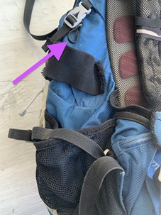 1. I sewed (attached)  a 1½“ paracord 'attachment loop' to the daypak ABOVE the water bottle pouch (see tip of purple arrow).